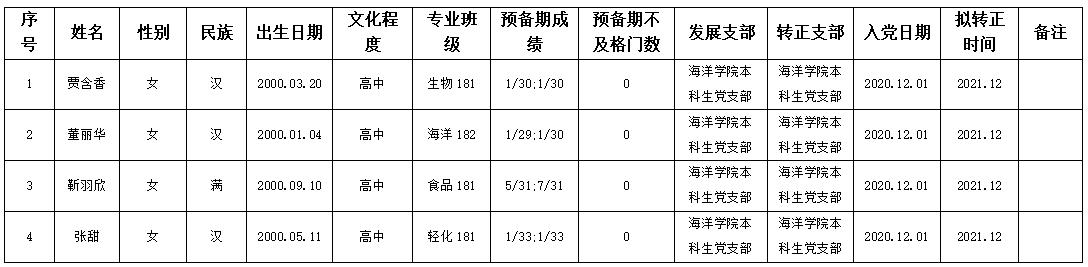 经海洋公司本科生党支部研究,拟将贾含香等同志转为中共正式党员,现将其有关情况予以公示。